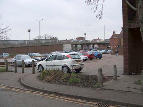 | This is as far as the ringroad got. The church in the background was to have been swept away and the buildings along that road - barrack Street - were derelict for years. | To the east of Magdalen Street the flyover descends to ground level in an area cleared of buildings and which is now a car park. The church yard is to the left. |